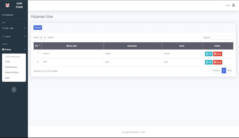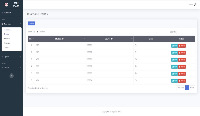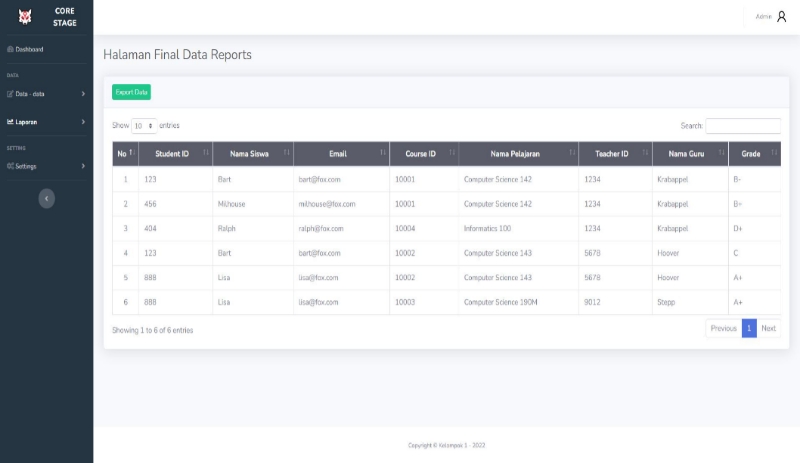 Core stage merupakan sebuah website yang memiliki fungsi utama sebagai pengolah data dari 4 rangkaian data yaitu student (pelajar), teacher (guru), course (pelajaran), dan grade (nilai). Dalam mengolah data, core stage memiliki beberapa fitur di dalamnya seperti CRUD (create, read, update, and delete), Export data, dan Backup serta Restore.